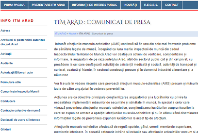 Întrucât afecțiunile musculo-scheletice (AMS) continuă să fie una din cele mai frecvente probleme de sănătate legate de muncă, începând cu luna martie inspectorii de muncă din cadrul Inspectoratelor Teritoriale de Muncă vor desfășura acțiuni de verificare, conștientizare și informare, la angajatorii de pe raza fiecarui județ, atât din sectorul public cât și din cel privat, cu precădere la cei care desfășoară activități de asistență medicală și socială, activități de transport și curierat, coafură și frizerie, în sectorul construcții precum și în domeniul industriei alimentare și a băuturilor.