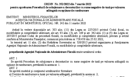 Dupa cum stiti, in Monitorul Oficial nr. 242 din 11 martie 2022, a fost publicat Ordinul președintelui ANAF nr. 352 din 07 martie 2022 pentru aprobarea Procedurii de soluționare a deconturilor cu sume negative de TVA cu opțiune de rambursare .