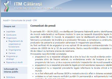 În perioada 05 – 08.04.2022, s-a desfăşurat Campania Naţională pentru identificarea cazurilor de muncă nedeclarată şi verificarea modului în care se respectă dispoziţiile legale în domeniul securităţi şi sănătăţii în muncă, la angajatorii care îşi desfăşoară activitatea în domeniul de fabricare a produselor de brutărie şi a produselor făinoase, a comerţului cu amănuntul al pâinii, produselor de patiserie şi produselor zaharoase în magazinele specializate.