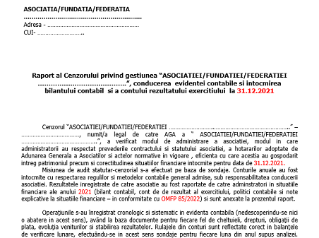 Stimati colegi, avand in vedere termenul limita de 02.05.2021 – DETALII AICI – va supunem atentiei, ca in fiecare an, modelul gratuit pentru Raport Cenzor/Cenzori, actualizat la nivelul anului 2022, necesar la completarea dosarului pentru depunerea bilantului contabil la 31.12.2021 (la ONG) – model ce poate fii folosit de o asociație/fundație/federație. Din experienta proprie va putem confirma ca se cere a fii prezent la dosar in momentul depunerii la DGFP (ghișeu sau online), chiar daca legislația prevede ca nu este necesar cenzor in cazul unui ONG cu pana la 3 asociați .