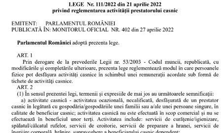 Dupa cum stiti deja (din articolele anterioare), in Monitorul Oficial nr. 402 din 27 aprilie 2022, a fost publicata Legea nr. 111 din 21 aprilie 2022 – privind reglementarea activităţii prestatorului casnic.