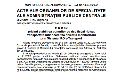 Stimati colegi, va informam pe aceasta cale ca, in Monitorul Oficial nr. 430 din 3 mai 2022, a fost publicat Ordinul președintelui ANAF nr. 802 din 29 aprilie 2022 – privind stabilirea bunurilor cu risc fiscal ridicat transportate rutier care fac obiectul monitorizării prin Sistemul RO e-Transport.