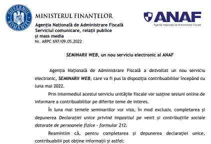 Agenția Națională de Administrare Fiscală a dezvoltat un nou serviciu electronic, SEMINARII WEB, care va fi pus la dispoziția contribuabililor începând cu luna mai 2022. Prin intermediul acestui serviciu unitățile fiscale vor susține sesiuni online de informare a contribuabililor pe diferite teme de interes, pe platforma Zoom.