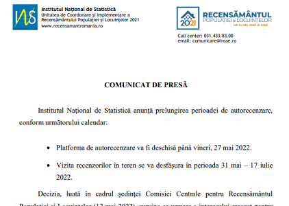 Institutul Naţional de Statistică anunţă prelungirea perioadei de autorecenzare, conform următorului calendar: