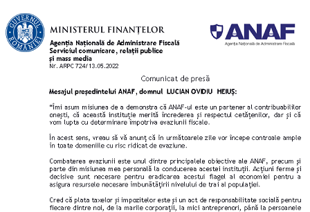Noul presedinte al ANAF, LUCIAN OVIDIU HEIUȘ, precizeaza intr-un comunciat de presa ca – în următoarele zile vor începe controale ample în toate domeniile cu risc ridicat de evaziune.