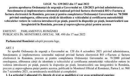 Stimati colegi, va informam pe aceasta cale ca, in Monitorul Oficial nr. 490 din 17 mai 2022, a fost publicat Legea nr. 139 din 17 mai 2022 – pentru aprobarea Ordonanţei de urgenţă a Guvernului nr. 120/2021 privind administrarea, funcţionarea şi implementarea sistemului naţional privind factura electronică RO e-Factura şi factura electronică în România, precum şi pentru completarea Ordonanţei Guvernului nr. 78/2000 privind omologarea, eliberarea cărţii de identitate a vehiculului şi certificarea autenticităţii vehiculelor rutiere în vederea introducerii pe piaţă, punerii la dispoziţie pe piaţă, înmatriculării sau înregistrării în România, precum şi supravegherea pieţei pentru acestea.