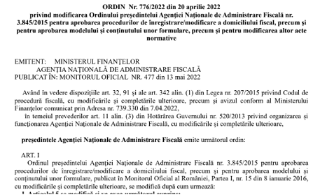 Dupa cum stiti deja, in Monitorul Oficial nr. 477 din 13 mai 2022, a fost publicat Ordinul președintelui ANAF nr. 776 din 20 aprilie 2022 – TEXT INTEGRAL – privind modificarea Ordinului președintelui Agenției Naționale de Administrare Fiscală nr. 3.845/2015 pentru aprobarea procedurilor de înregistrare/modificare a domiciliului fiscal, precum și pentru aprobarea modelului și conținutului unor formulare, precum și pentru modificarea altor acte normative.