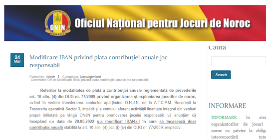 Referitor la modalitatea de plată a contribuției anuale reglementată de prevederile art. 10 alin. (4) din OUG nr. 77/2009 privind organizarea și exploatarea jocurilor de noroc, având în vedere transferarea conturilor aparținând O.N.J.N. de la A.T.C.P.M. București la Trezoreria operativă Sector 3, implicit și a contului aferent activității finanțate integral din venituri proprii înființată pe lângă ONJN pentru promovarea jocului responsabil, vă anunțăm că începând cu data de 20.05.2022 s-a modificat IBAN-ul în care se încasează doar contribuția anuală stabilită la art. 10 alin. (4) pct. (i)-(iv) din OUG nr. 77/2009, respectiv: