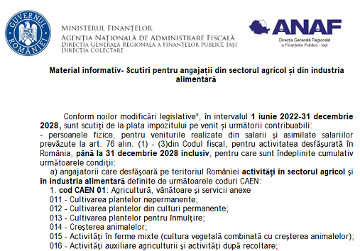 Va supunem atentiei un material oficial (2 pagini) – elaborat de DGRFP Iasi (institutie careia ii multumim pentru posibilitatea preluarii informatiilor) – ce prezinta, o serie de informatii cu privire la – scutirile pentru angajații din sectorul agricol și din industria alimentară – material publicat în data de 23.05.2022.