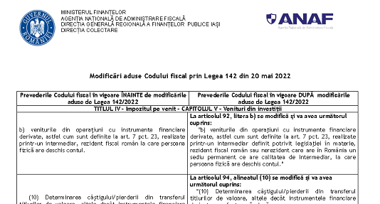 Va supunem atentiei un material oficial (12 pagini) – elaborat de AJFP Iasi (institutie careia ii multumim pentru posibilitatea preluarii informatiilor) – ce prezinta, o serie de informatii cu privire la – modificările aduse Codului fiscal prin Legea 142 din 20 mai 2022 – material publicat în luna iunie 2022.