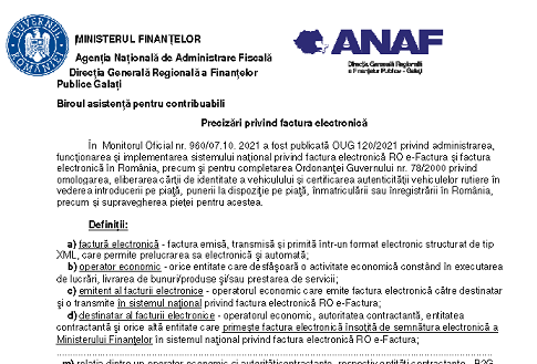 Va supunem atentiei un material oficial (3 pagini) – elaborat de AJFP Galați (institutie careia ii multumim pentru posibilitatea preluarii informatiilor) – ce prezinta, o serie de informatii cu privire la – ultimele modificari in ceea ce priveste sistemul national privind factura electronică – RO e-Factura – material publicat în luna iunie 2022.