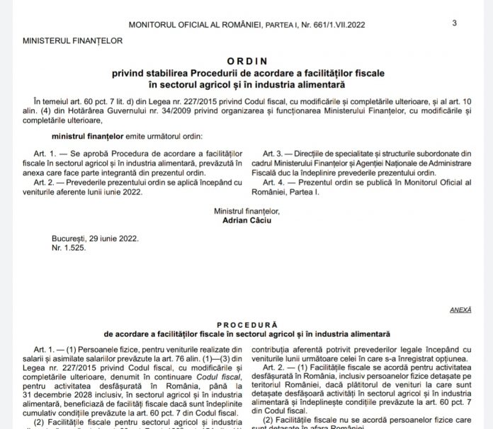 […] Dupa cum stiti deja, in Monitorul Oficial nr. 661 din 01 iulie 2022, a fost publicat Ordinul Ministrului Finanțelor nr. 1.525 din 29 iunie 2022 – privind stabilirea Procedurii de acordare a facilităților fiscale în sectorul agricol și în industria alimentară – text integral aici. […]