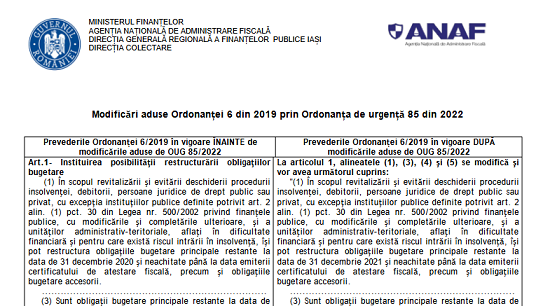 Va supunem atentiei un material oficial (6 pagini) – elaborat de Direcţia Generală Regională a Finanţelor Publice Iasi (institutie careia ii multumim pentru posibilitatea preluarii informatiilor) – ce prezinta o serie de informatii cu privire la – modificările aduse OG nr. 6/2019 prin Ordonanța de Urgență nr. 85/2022 – material publicat în luna iunie-iulie 2022.
