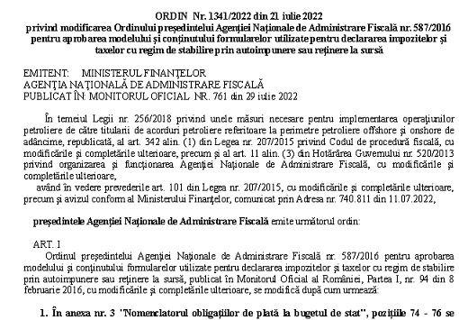 Avand in vedere ca in Monitorul Oficial nr. 761 din 29 iulie 2022, a fost publicat Ordinul președintelui ANAF nr. 1341 din 21 iulie 2022 privind modificarea Ordinului preşedintelui Agenţiei Naţionale de Administrare Fiscală nr. 587/2016 pentru aprobarea modelului şi conţinutului formularelor utilizate pentru declararea impozitelor şi taxelor cu regim de stabilire prin autoimpunere sau reţinere la sursă – va supunem atentiei un info despre acesta, dar si textul integral al acestuia – multumita AJFP Dambovita (institutie careia ii multumim pentru posibilitatea preluarii informatiilor).