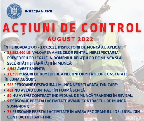 Inspecția Muncii, prin inspectoratele teritoriale de muncă, a desfășurat, în perioada 29.07 – 1.09.2022, acţiuni de control în urma cărora s-au aplicat amenzi în valoare de 12.552.400 lei pentru nerespectarea prevederilor legale în domeniul relațiilor de muncă și al securității și sănătății în muncă. Au fost aplicate 4.562 avertismente și au fost dispuse 11.255 măsuri de remediere a neconformităților constatate.