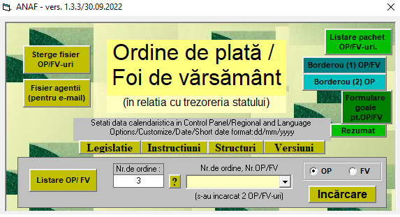 Pe site-ul oficial al ANAF a fost actualizata – aplicaţia pentru prelucrarea asistată, validarea şi listarea ordinelor de plată/foi de vărsământ conform OMFP nr. 246/2005 cu modificările şi completările ulterioare şi OMEF nr. 1294/2007 – aceasta fiind acum la – vers. 1.3.3.