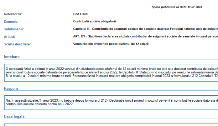 O persoană fizică a obținut în anul 2022 venituri din dividende peste plafonul de 12 salarii minime brute pe țară și a declarat contribuția de asigurări sociale de sănătate (CASS) în formularul 212 – Declarație unică privind impozitul pe venit și contribuțiile sociale datorate de persoanele fizice aferent anului 2022, la Capitolul II ”Date privind impozitul pe veniturile estimate/norma de venit a se realiza în România şi contribuţiile sociale datorate”, secțiunea II.2.2 la punctul B, la nivelul a 12 salarii minime brute pe țară. Persoana fizică în cauză mai are obligația completării în anul 2023 a formularului 212 Capitolul I ”Date privind impozitul pe veniturile realizate şi contribuţiile sociale datorate”?