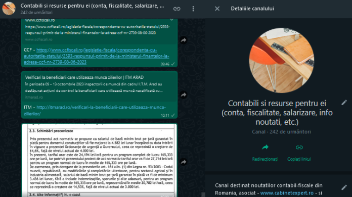 Stimați colegi, va informam ca am inaugurat recent, pe WhatsApp Channels – si un canal destinat noutăților contabil-fiscale din Romania, asociat – www.cabinetexpert.ro – si paginii de Facebook – https://www.facebook.com/fiscalitate . LINK CANAL – https://whatsapp.com/channel/0029Va8Im13GJP8LBB48PC2a .