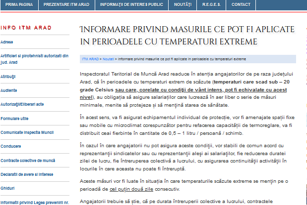 Inspectoratele Teritoriale de Muncă readuc în atenția angajatorilor de pe raza fiecărui județ, că în perioadele cu temperaturi extrem de scăzute (temperaturi care scad sub – 20 grade Celsius sau care, corelate cu condiţii de vânt intens, pot fi echivalate cu acest nivel), au obligația să asigure salariaților care lucrează în aer liber o serie de măsuri minimale, menite să protejeze și să menţină starea de sănătate.