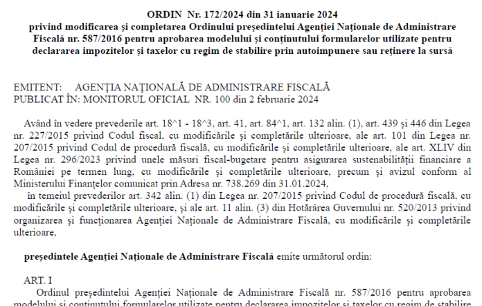 Avand in vedere ca, in MONITORUL OFICIAL NR. 100 din 02 februarie 2024 , a fost publicat Ordinul președintelui ANAF nr. 172 din 31 ianuarie 2024 – privind modificarea şi completarea Ordinului preşedintelui Agenţiei Naţionale de Administrare Fiscală nr. 587/2016 pentru aprobarea modelului şi conţinutului formularelor utilizate pentru declararea impozitelor şi taxelor cu regim de stabilire prin autoimpunere sau reţinere la sursă – va supunem atentiei textul integral al actului normativ, dar si un info rapid – via A.J.F.P. Dambovita (institutie careia ii multumim pentru posibilitatea preluării informatiilor).