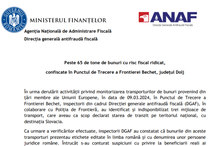 În urma derulării activității privind monitorizarea transporturilor de bunuri provenind din țări membre ale Uniunii Europene, în data de 09.03.2024, în Punctul de Trecere a Frontierei Bechet, inspectorii din cadrul Direcției generale antifraudă fiscală (DGAF), în colaborare cu Poliția de Frontieră, au identificat și indisponibilizat trei mijloace de transport, care aveau ca scop declarat starea de tranzit pe teritoriul național, cu destinația Slovacia.