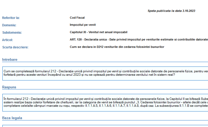 " Pentru contabilitate și salarizare - recomandăm NextUp " Intrebare Cum se completează formularul 212 - Declarație unică privind impozitul pe venit și contribuțiile sociale datorate de persoanele fizice, pentru veniturile obținute din cedarea folosinței bunurilor, având în vedere că a fost eliminată cota...Cum se declară in Declarația Unică 212 veniturile din cedarea folosinței bunurilor - răspuns oficial ANAF