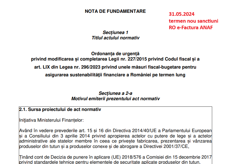 -💡Totodată, se propune extinderea cu 2 luni a perioadei în care nu se aplică sancțiuni pentru nerespectarea termenului-limită de 5 zile lucrătoare pentru transmiterea facturilor în sistemul naţional privind factura electronică RO e-Factura, respectiv această faptă nu se va sancționa în perioada 1 ianuarie – 31 mai 2024.