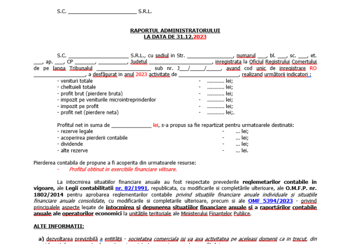 PENTRU A DESCARCA MODELUL ACTUALIZAT (2024) AL RAPORTULUI ADMINISTRATORULUI – NECESAR PENTRU DOSAR BILANT LA 31.12.2023 – CLICK AICI