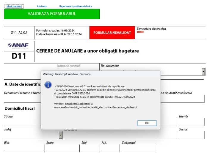 D11 (CERERE / NOTIFICARE anulare obligații bugetare) – ANAF a actualizat recent PDF-ul inteligent oficial