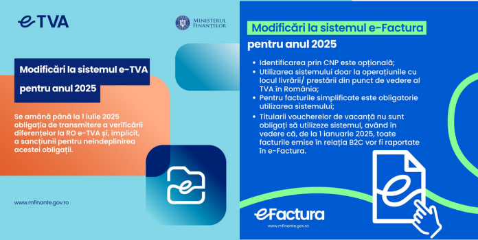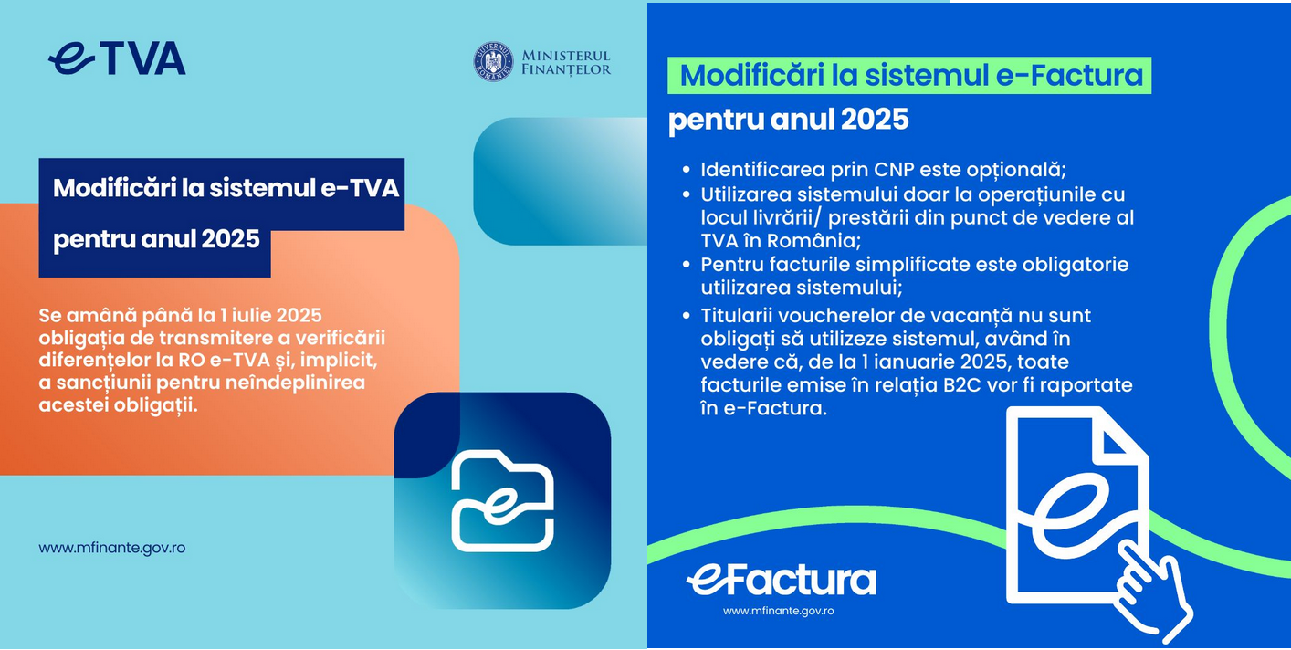 În ceea ce privește sitemul național RO e-TVA, se amână până la 1 iulie 2025, dispozițiile privind obligația transmiterii de către contribuabili a rezultatului verificărilor realizate asupra diferențelor comunicate de către ANAF prin ”Notificarea de conformare RO e-TVA”, precum și a sancțiunii pentru neîndeplinirea acestei obligații.