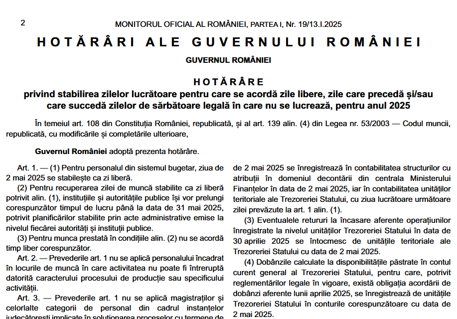 Stimati colegi, va informam ca, in MONITORUL OFICIAL AL ROMÂNIEI nr. 19/13.01.2025 – a fost publicata Hotararea Guvernului României nr. 2 din 10 ianuarie 2025 – privind stabilirea zilelor lucrătoare pentru care se acordă zile libere, zile care precedă și/sau care succedă zilelor de sărbătoare legală în care nu se lucrează, pentru anul 2025