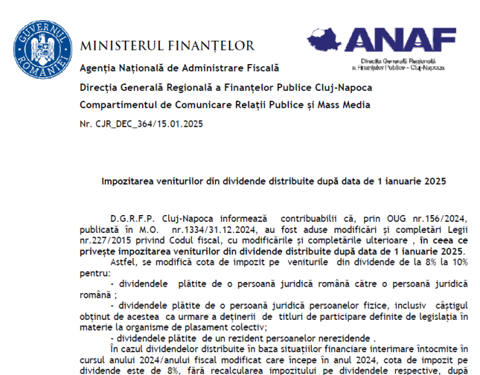 ANAF informează contribuabilii că, prin OUG nr.156/2024, publicată în M.O. nr.1334/31.12.2024, au fost aduse modificări și completări Legii nr.227/2015 privind Codul fiscal, cu modificările și completările ulterioare , în ceea ce privește impozitarea veniturilor din dividende distribuite după data de 1 ianuarie 2025.