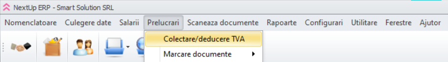Aspectele legate de colectarea/deducerea de TVA sunt gestionate în cadrul aplicației NextUP din cadrul secțiunii Prelucrări, colectare/deducere TVA