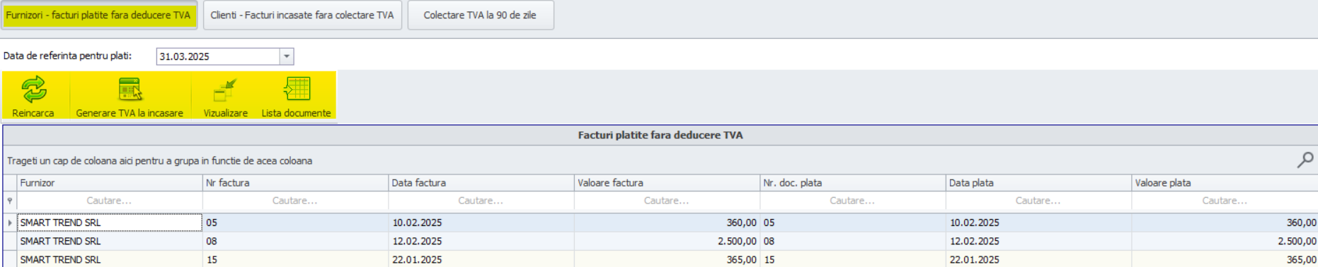 În cadrul tab-ului Furnizori-Facturi plătite fără deducere TVA regăsim aspect legate de facturile achitate dar pentru care nu a fost generată nota privind deducerea taxei pe valoare adăugată. Realizarea acestei verificări se realizează prin alegerea datei până la care au fost efectuate plăți pentru facturi cu TVA la încasare. Această acțiune este necesară în vederea distribuirii TVA-ului exigibil. Acțiunile specifice acestui submeniu sunt legate de Generarea TVA la încasare, Reîncarcă, Vizualizare, Listă documente.