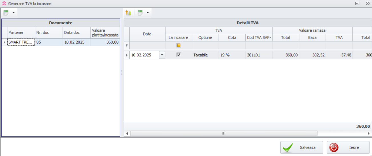 Ulterior acestei operațiuni, apăsăm butonul Generare TVA la încasare pentru a obține nota contabilă.