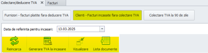 În cadrul subsecțiunii Clienți-Facturi încasate fără colectare TVA regăsim aceleași funcționalități legate de facturile încasate fără colectare TVA asemenea subsecțiunii anterioare, și anume Facturi plătite fără deducere TVA. Este vorba despre rubrica privind specificarea datei de referință pentru încasări, butonul Reîncarcă, Generarea TVA la încasare, Vizualizare și Listă documente.