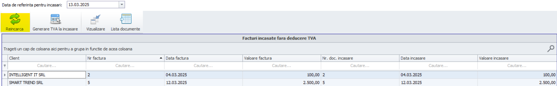 Asemenea facturilor plătite fără deducerea TVA-ului, se va selecta o dată de referință care face referire la data până la care s-au efectuat încasări și s-a omis generarea TVA-ului exigibil. Acționăm butonul Reîncarcă pentru a fi evidențiate facturile respective.