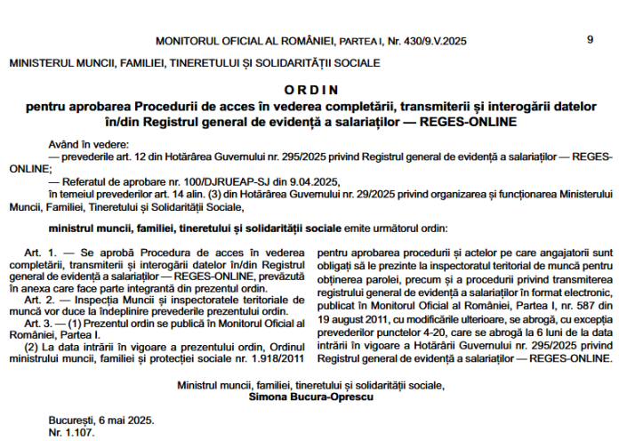 Stimati colegi, va informam pe aceasta cale ca, in Monitorul Oficial nr. nr. 430 din 09 mai 2025 , a fost publicat Ordinul MINISTERULUI MUNCII, FAMILIEI, TINERETULUI ȘI SOLIDARITĂȚII SOCIALE nr. 1.107 din 06 mai 2025 – pentru aprobarea Procedurii de acces în vederea completării, transmiterii și interogării datelor în/din Registrul general de evidență a salariaților — REGES-ONLINE. Avand in vedere noutatile, va supunem atentiei textul integral.