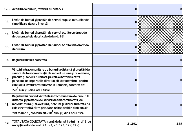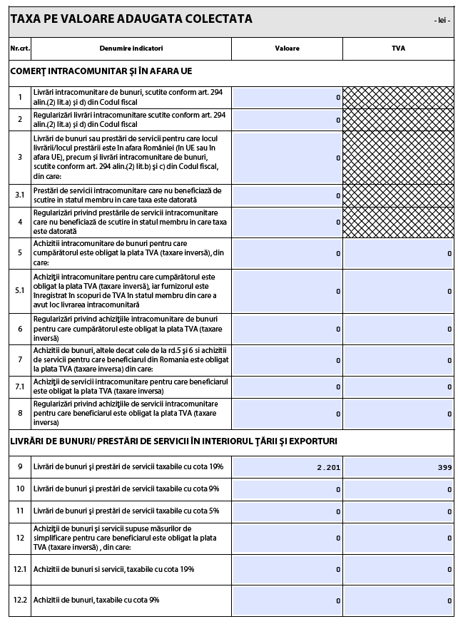 În cadrul secțiunii Taxa pe valoare adăugată colectată date sunt completate pe baza informațiile existente în cadrul evidenței financiar-contabile a companiei. Astfel, rândul 9 al decontului, Livrări de bunuri și prestări de servicii taxabile cu cota de 19% a fost completat astfel: baza impozabilă=2201 lei, TVA=399 lei.