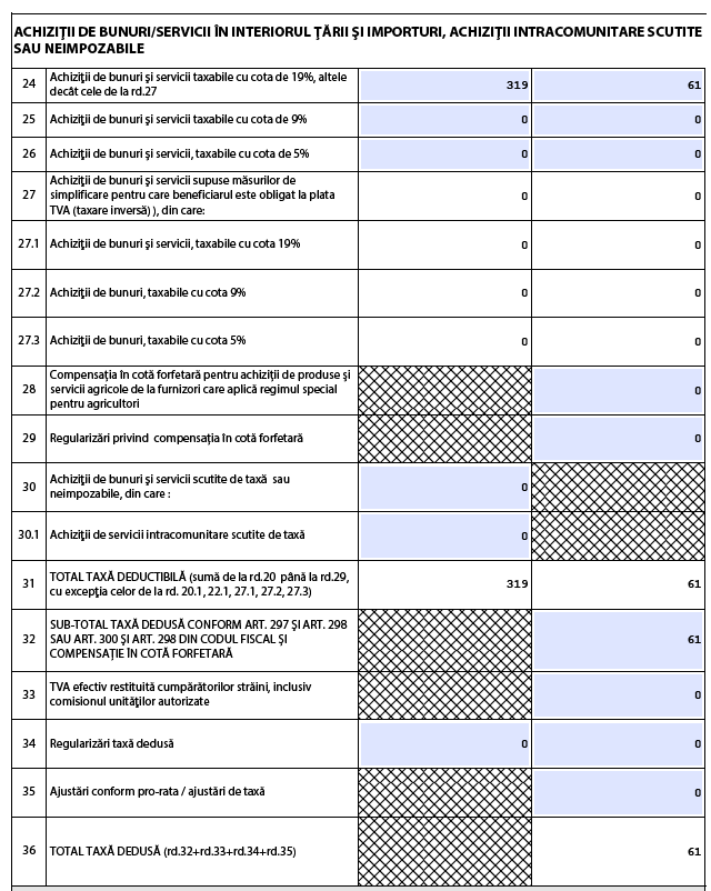 Trecând la următoarea secțiune a decontului de taxă pe valoare adăugată (D300), vom vizualiza imaginea taxei pe valoare adăugată deductibilă a companiei din cadrul perioadei de referință. Astfel, remarcăm două subsecțiuni, și anume: Achiziții intracomunitare de bunuri și alte achiziții de bunuri și servicii impozabile în România, respectiv, Achiziții de bunuri/servicii în interiorul țării și importuri, achiziții intracomunitare scutite sau neimpozabile. Astfel, aceste câmpuri vor fi completate pa baza jurnalului de cumpărări aferent lunii de referință pentru care este generat decontul.