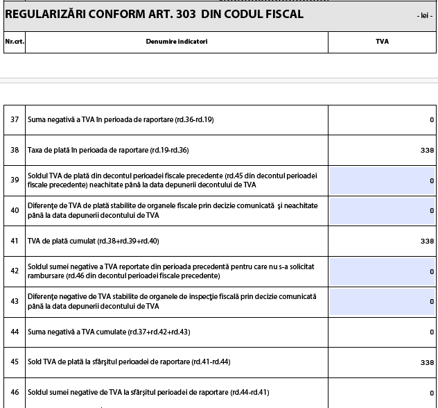 În cadrul următoarei secțiuni vom vizualiza aspecte legate de Regularizări conform art. 303 din Codul Fiscal. Astfel, pe baza celor două componente a taxei pe valoare adăugată, și anume TVA deductibil și TVA colectat, putem să identificăm două situații concrete, și anume: apariția taxei pe valoarea adăugată de plată, respectiv, conturarea taxei pe valoare adăugată de recuperat. În cazul nostru, identificăm categoria TVA de plată, ca urmare a regularizării dintre cele două elemente tipuri de TVA.