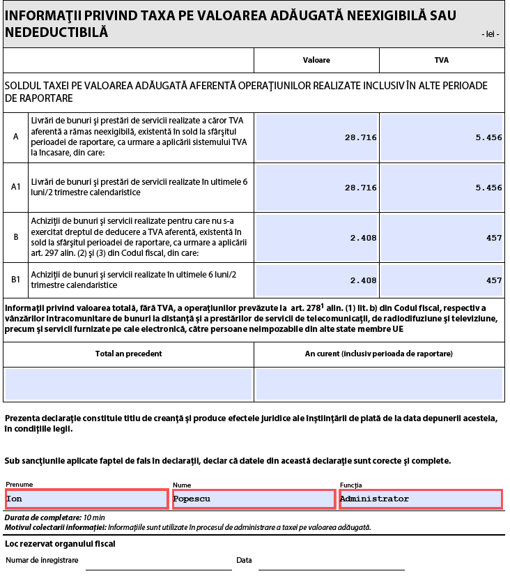 Ultima parte a declarației surprinde aspecte legate de Informații privind taxa pe valoarea adăugată neexibilă sau nedeductibilă. Astfel, vom regăsi punctual aspecte redate de soldul taxei pe valoare adăugată aferentă operațiunilor realizate inclusiv în alte perioade de raportare.