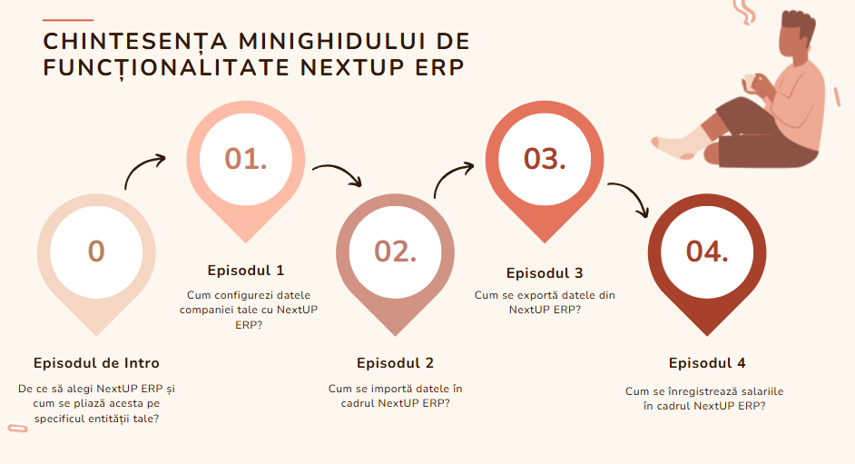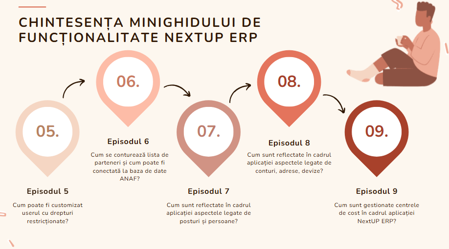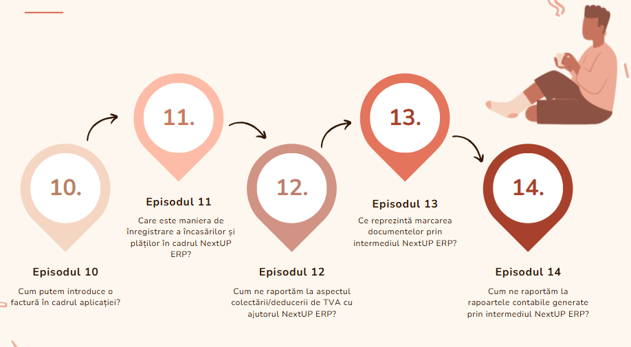 Așadar, mai sus regăsești imaginea a ceea ce reprezintă exploarea pas cu pas a aplicației NextUP ERP prin intermediul celor 14 episoade.