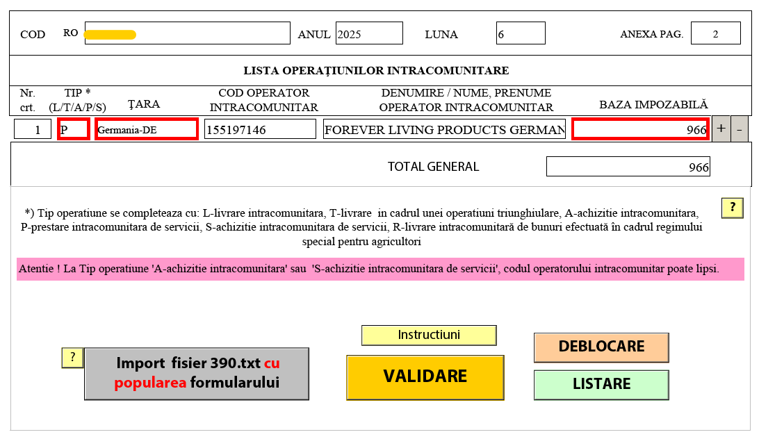 Ultima parte a declarației include lista operațiunilor intracomunitare care are la bază documentele (factura) care atestă derularea tranzacției intracomunitare.