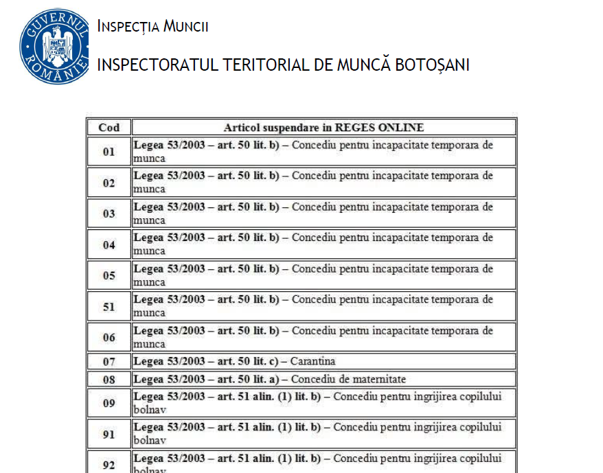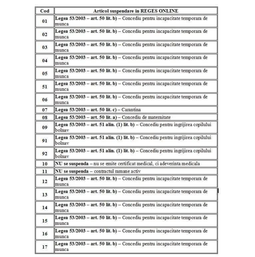 Prin urmare, odată cu trecerea la REGES-ONLINE se transmit în Registru şi suspendările în baza certificatelor medicale, când transmiterea în Registru se face în termen de 3 zile lucrătoare de la data înregistrării la angajator a certificatului de concediu medical. Se transmite data de început şi data de sfârşit a suspendării, precum şi temeiul legal, respectiv articolul din Legea nr. 53/2003 Codul muncii, republicat și actualizat, în baza căruia are loc suspendarea.