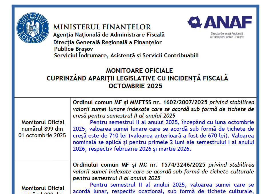 " Pentru contabilitate și salarizare - recomandăm NextUp " Va supunem atentiei un material oficial (cca. 6 pagini) - elaborat de Directia Generala Regionala a Finanţelor Publice BRASOV (institutie careia ii multumim pentru posibilitatea preluarii informatiilor) - ce prezinta o...ANAF - monitoare oficiale cuprinzând apariții legislative cu incidență fiscală (din luna octombrie 2025)