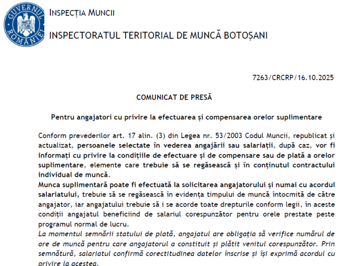 ITM reaminteste faptul că durata maximă legală a timpului de muncă nu poate depăși 48 de ore pe săptămână, inclusiv ore suplimentare, cu excepția situației când durata poate fi prelungită peste 48 de ore, cu condiția ca media orelor de muncă, calculate pe o perioadă de referință de 4 luni calendaristice, să nu depășească 48 de ore/săptămână. Pentru anumite activități sau profesii stabilite prin contractul colectiv de muncă aplicabil, se pot negocia, prin contractul colectiv respectiv, perioade de referință mai mari de 4 luni, dar care să nu depășească 6 luni. Munca prestată în afara duratei normale a timpului de muncă săptămânal este considerată muncă suplimentară.