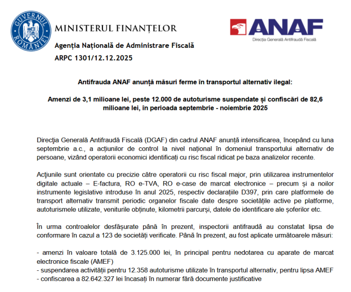Acţiunile sunt orientate cu precizie către operatorii cu risc fiscal major, prin utilizarea instrumentelor digitale actuale – E-factura, RO e-TVA, RO e-case de marcat electronice – precum și a noilor instrumente legislative introduse în anul 2025, respectiv declarațiile D397, prin care platformele de transport alternativ transmit periodic organelor fiscale date despre societățile active pe platforme, autoturismele utilizate, veniturile obținute, kilometrii parcurși, datele de identificare ale șoferilor etc.