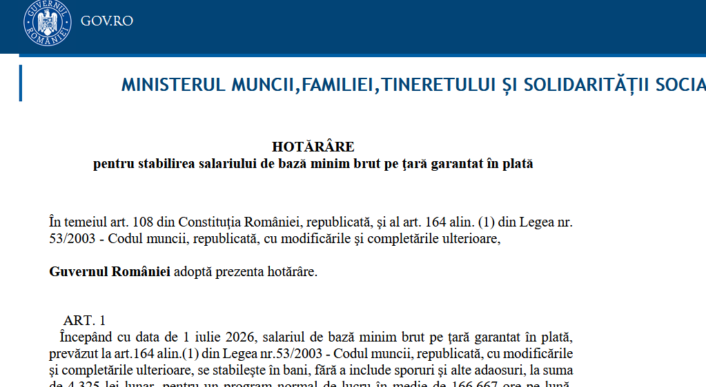 Stimati colegi, va informam ca, Ministerului Muncii, Familiei, Tineretului și Solidarității Sociale a postat recent pe site – proiectul de HOTĂRÂRE pentru stabilirea salariului de bază minim brut pe ţară garantat în plată – prin care se propune ca salariul de bază minim brut pe ţară garantat în plată să fie majorat la 4.325 lei lunar începând cu data de 1 iulie 2026, ceea ce reprezintă o creștere de 6,8 %, față de luna iunie 2026.