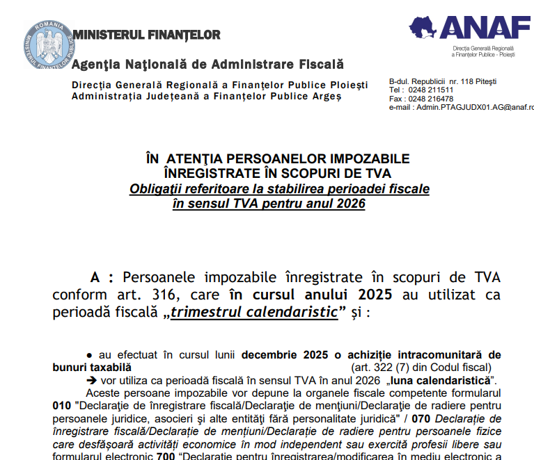 Va supunem atentiei un material oficial (cca. 3 pagini) – elaborat de Administrația Județeană a Finanțelor Publice Argeș (institutie careia ii multumim pentru posibilitatea preluarii informatiilor) – ce prezinta o serie de informații cu privire la – obligaţiile referitoare la stabilirea perioadei fiscaleîn sensul TVA pentru anul 2026 (DOAR PERSOANELE IMPOZABILE ÎNREGISTRATE ÎN SCOPURI DE TVA) – material publicat in luna ianuarie 2026.